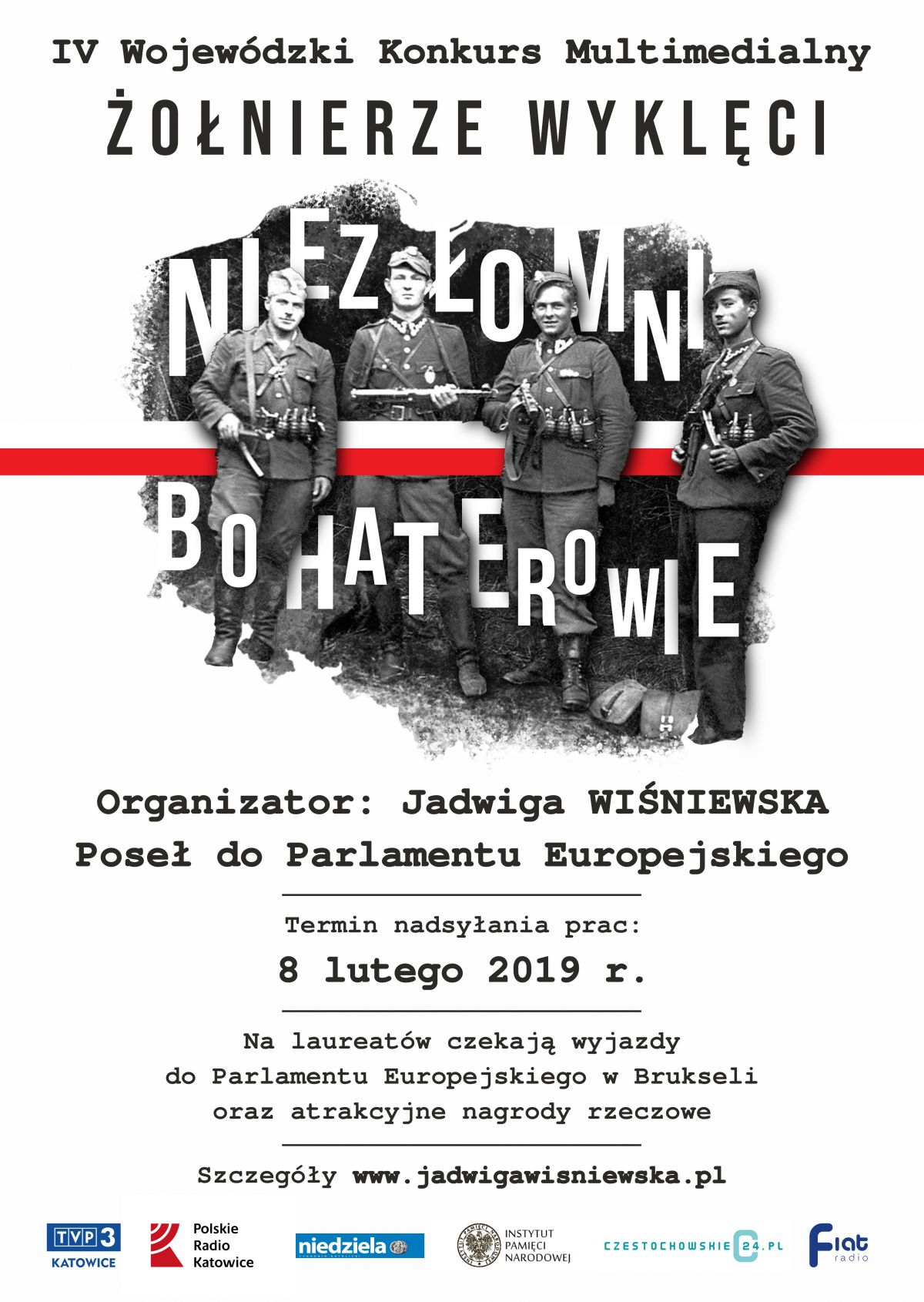 Prace konkursowe należy nadsyłać do 8 lutego 2019 r., na adres: Biuro Poselskie Poseł do Parlamentu EuropejskiegoJadwigi Wiśniewskiej, Al. NMP 24/11, 42-200 Częstochowa. Koperta powinna być opatrzona opisem: IV Wojewódzki Konkurs Multimedialny „Żołnierze Wyklęci. Niezłomni Bohaterowie”.