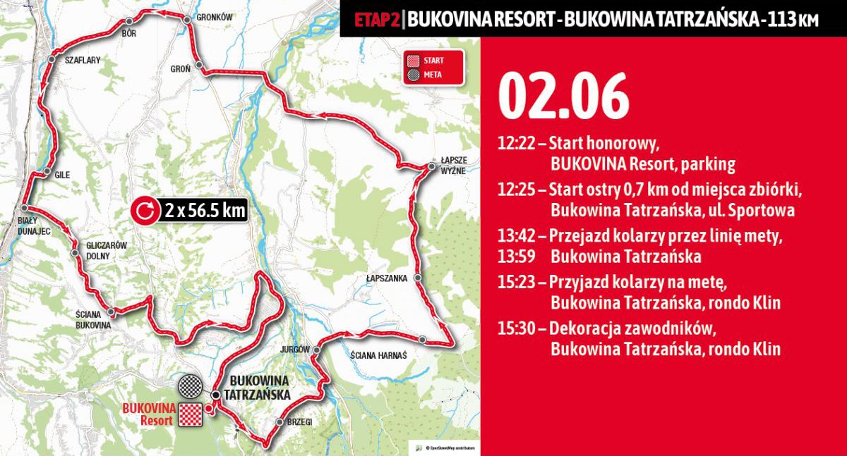 Niedzielny etap, wyścig ze startu wspólnego BUKOVINA RESORT – Bukowina Tatrzańska, to dwie rundy o łącznej długości 113 kilometrów. Trasa doskonale znana z królewskich etapów Tour de Pologne UCI World Tour z podjazdami na Ścianę Harnaś i Ścianę BUKOVINA. Inaczej jednak niż w wyścigu UCI World Tour tu łączność radiowa z zawodnikami będzie zabroniona. Start honorowy o 12:22.