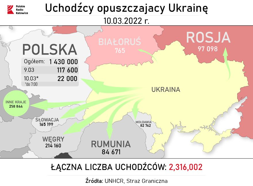 [12:00] Działająca w ramach ONZ Międzynarodowa Organizacja do spraw Migracji poinformowała, że do 10 marca już 2 miliony 300 tysięcy osób wyjechało z Ukrainy. Ponad 112 tysięcy uciekających to obywatele krajów trzecich. Według danych Straży Granicznej, łącznie od 24 lutego, czyli od dnia rosyjskiej agresji na Ukrainę, do Polski przybyło prawie półtora miliona uchodźców.