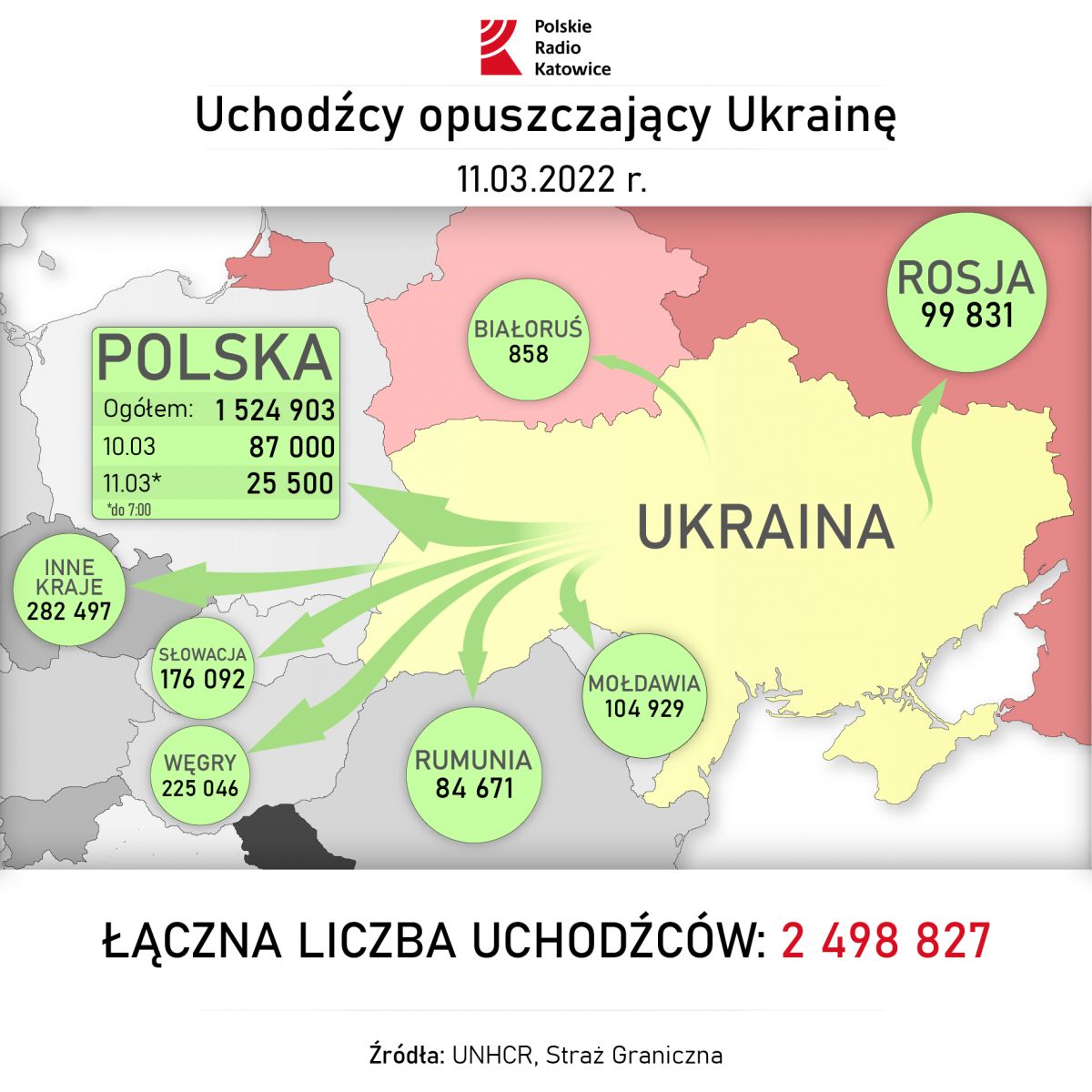 [8:00] Straż Graniczna poinformowała, że dzisiaj do godziny 07.00 rano z Ukrainy do Polski odprawiono prawie 25 i pół tysiąca osób. Wczoraj granicę przekroczyło 87 tysięcy osób.